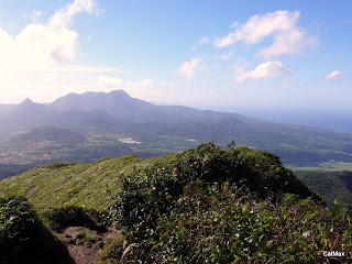 Très vite, la montée est abrupte. Nous sommes donc rapidement récompensés puisque le paysage s'offre à nous, à nos pieds, splendide. Au loin, les Pitons du Carbet semblent rivaliser avec La Pelée.
